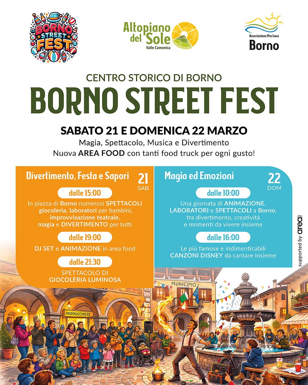 Artisti di strada, magia, musica, improvvisazione, spettacoli per tutte le età e quest’anno una grande novità: la nuova area Food Truck, con tante proposte golose per accontentare ogni gusto e trasformare l’evento in una vera festa da vivere fino in fondo.